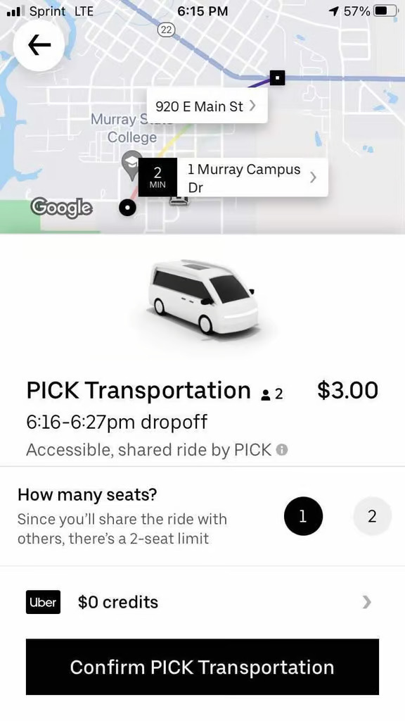 Individuals looking to utilize PICK Transportation can book rides through Uber’s mobile app or website, or by calling by phone the region’s mobility management center (RMMC). Initially funded by a Veterans Transportation & Community Living Initiative (VTCLI) grant, the RMMC serves as a one-call/one-click center for coordinating regional transportation services within Northeast Oklahoma. When a ride is requested, users receive in-app notifications about their ride status and have access to the map interface, which shows the distances between users’ locations, pick-up points, and the driver’s location in real time. Those without smartphones can receive a robot call or an SMS with details about their trip and driver and a link to a live map showing their driver’s location before and after pick-up.
