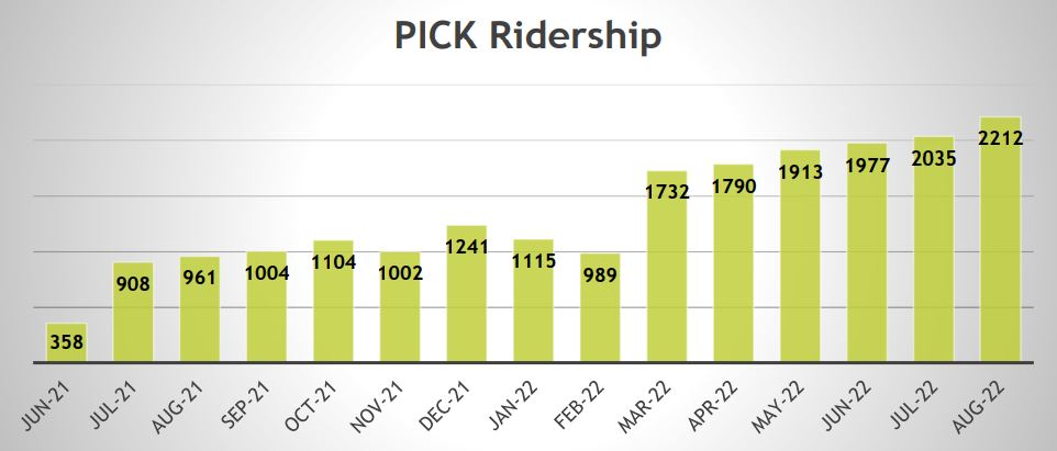 Because the program operates within a consortium of transit providers and serves 21 communities, PICK Transportation released a detailed data report showing ridership numbers for each community by day of the week and by time of the day. The report is based on data from June 1st, 2021, to July 31st, 2022, and helps highlight the program’s impact. The full report is available here.